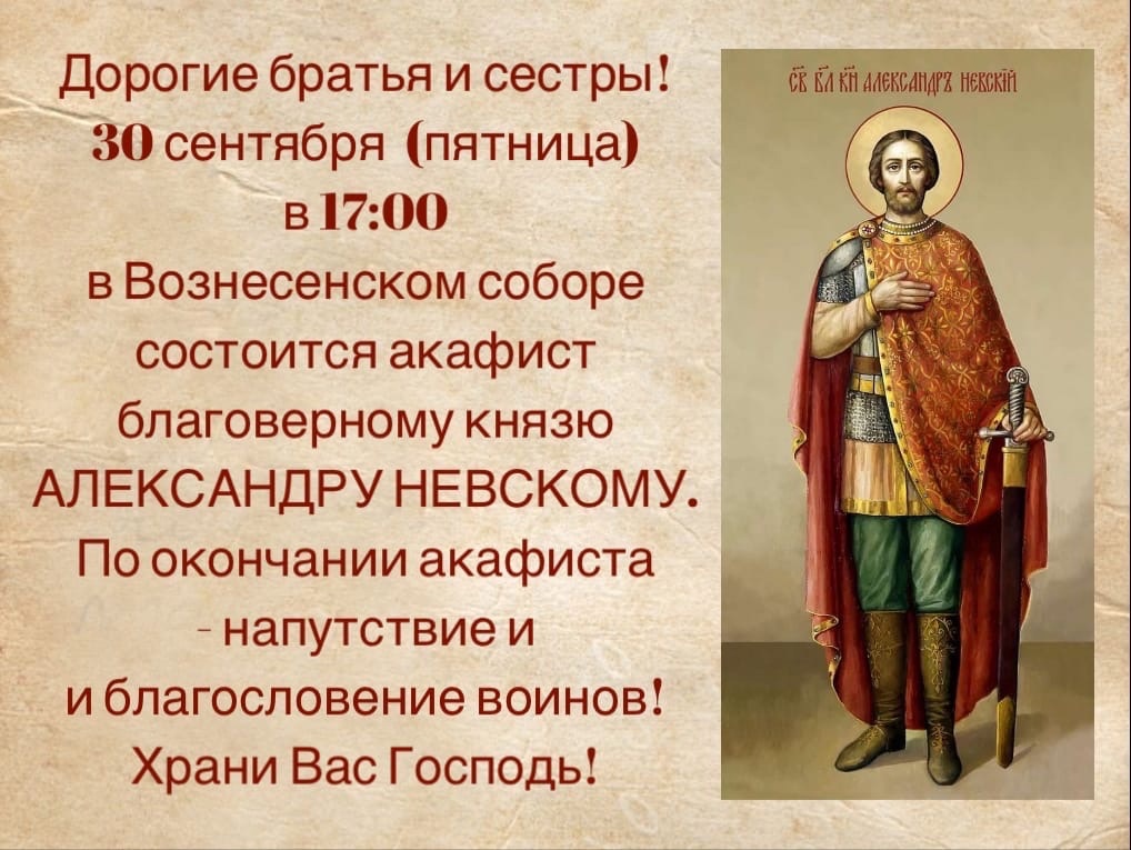 Дорогие братья и сестры! 30 сентября в 17:00 в Вознесенском кафедральном соборе будет совершён акафист святому благоверному князю Александру Невскому. По окончании акафиста — напутствие и благословение воинов. Приглашаем всех призывников и их родных помолиться о благополучном прохождении воинской службы!